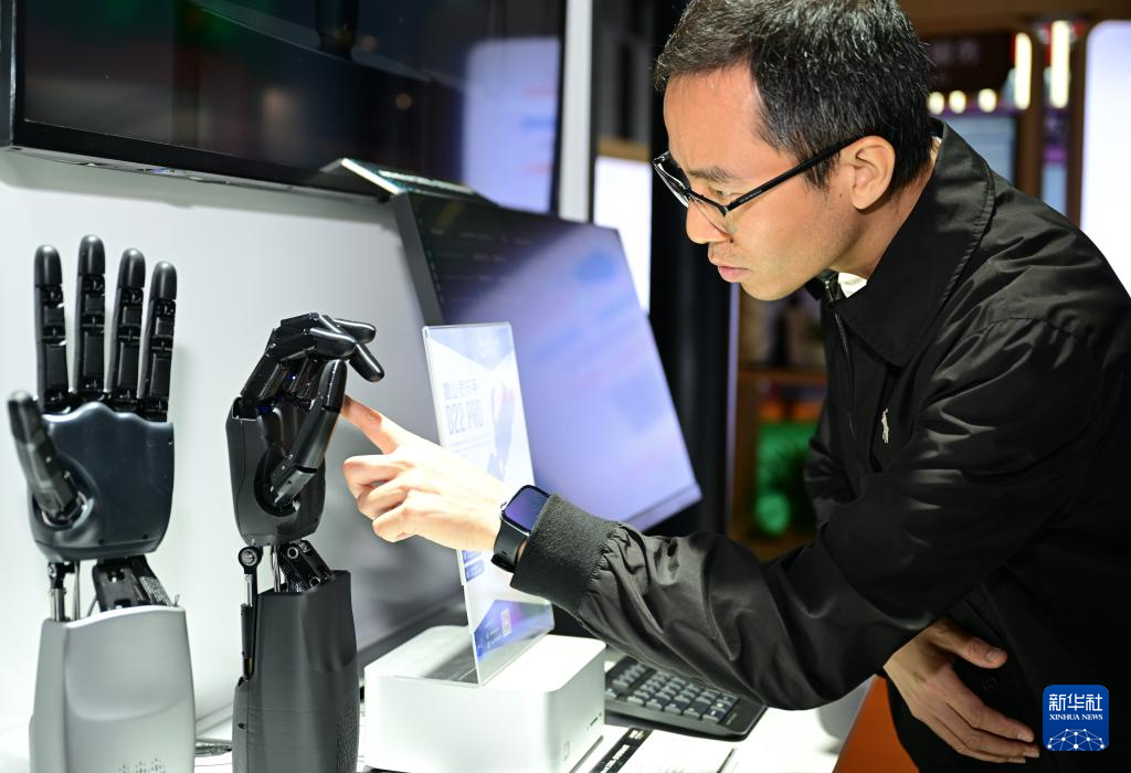 11月6日,在第八届进博会技术装备展区,观众在触摸一款灵巧手。