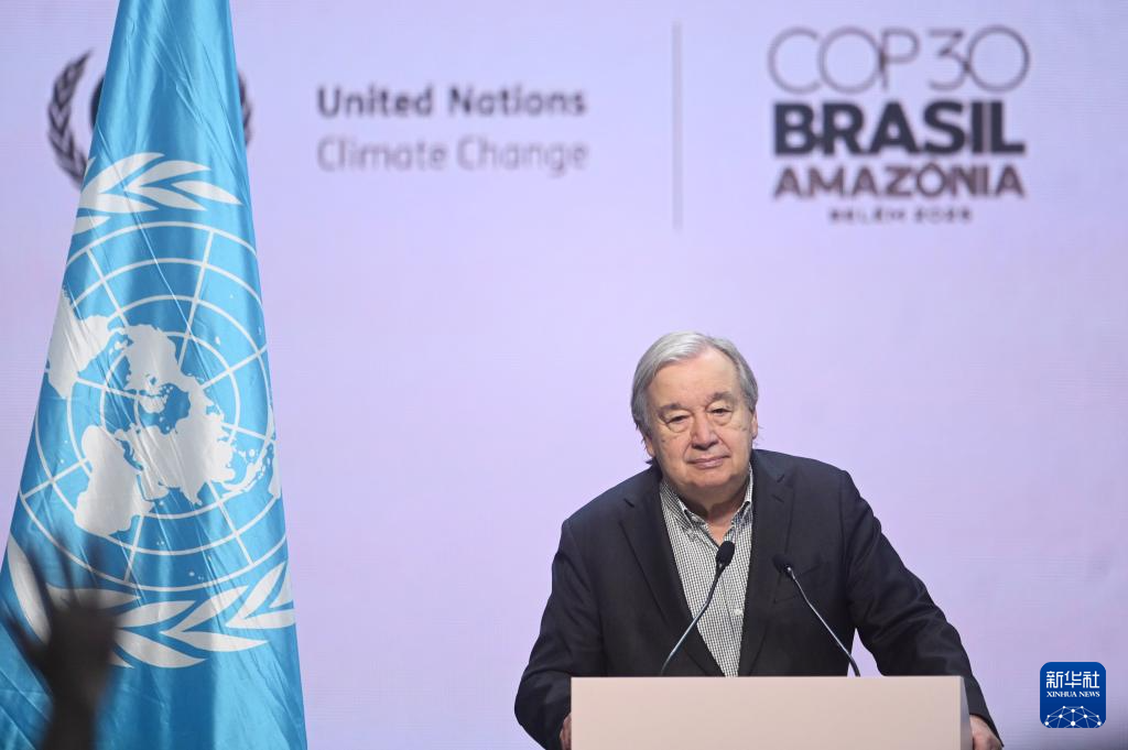 11月20日,联合国秘书长古特雷斯在巴西贝伦举行的新闻发布会上发言。新华社发(卢西奥·塔沃拉摄)