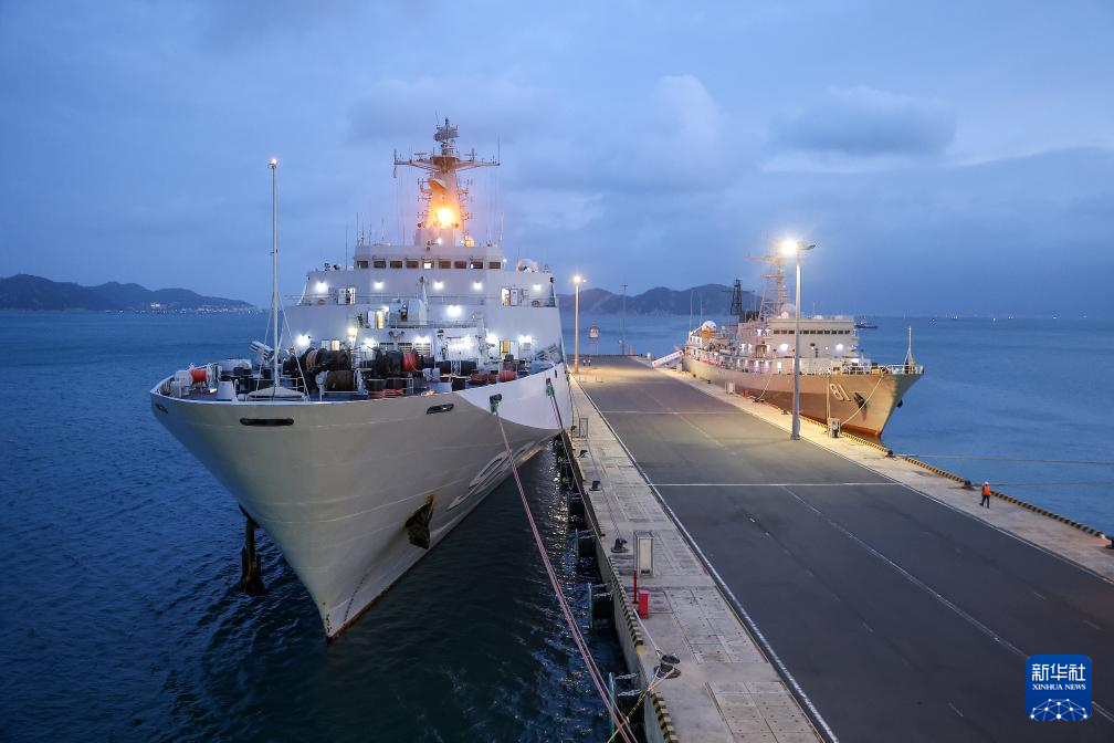 11月24日,中国海军长白山舰和郑和舰夜泊越南金兰港码头。新华社发(吕志浩摄)