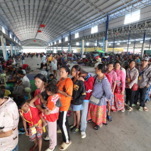 12月12日,在柬埔寨班迭棉吉省的一处居民安置点,因柬泰边境冲突而撤离的柬埔寨民众排队领取物资。新华社发(索万纳拉摄)