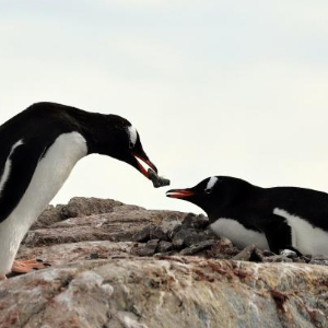 12月13日,在南极洲,两只南极鸬鹚衔来水草筑巢。