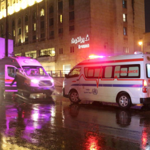 2026年1月1日凌晨,在叙利亚阿勒颇市,救护车停在袭击事发地点附近。 新华社发