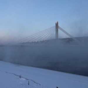 1月3日,在芬兰罗瓦涅米,凯米河上一座大桥掩映在冰雾里。