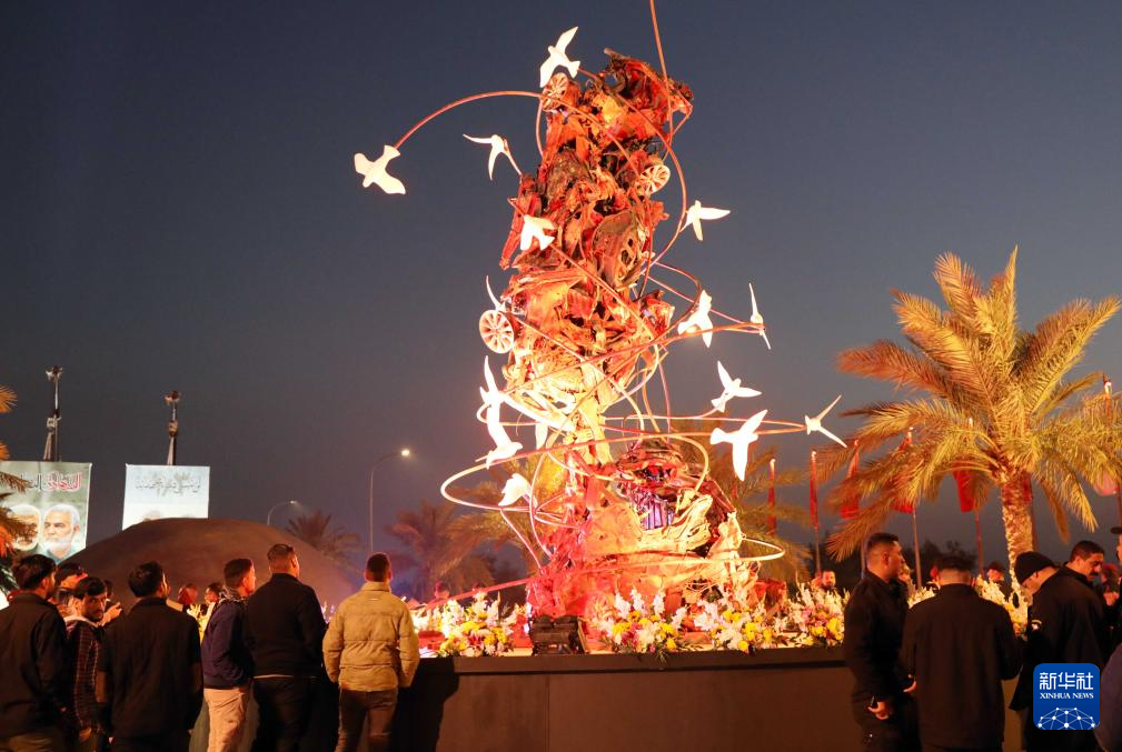 1月2日,在伊拉克首都巴格达,民众聚集在一座纪念碑前,该纪念碑由2020年1月3日遭美军袭击的车辆残骸制成。 新华社发(哈利勒·达伍德摄)