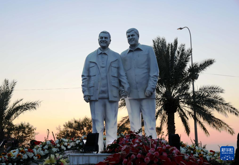 这是1月2日在伊拉克首都巴格达拍摄的卡西姆·苏莱曼尼(左)和阿布·迈赫迪·穆汉迪斯(右)雕像。 新华社发(哈利勒·达伍德摄)