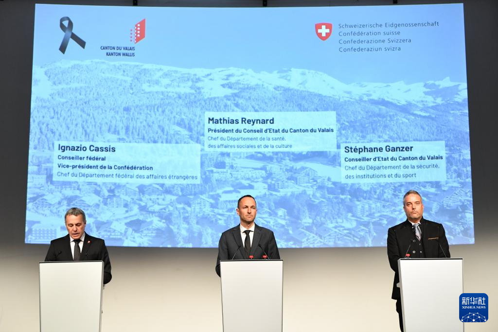 1月9日, 在瑞士瓦莱州马蒂尼,瑞士外长卡西斯(左)在哀悼仪式后举行的新闻发布会上讲话。新华社记者 连漪 摄