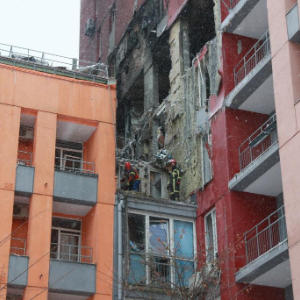2026年1月9日,乌克兰首都基辅市第聂伯区一栋公寓楼被无人机击中,救援人员正在拆除受损墙体。乌克兰空军9日在社交媒体上说,俄罗斯当天动用包括一枚中程弹道导弹在内的36枚导弹和242架无人机袭击乌克兰关键基础设施。新华社记者 李东旭 摄