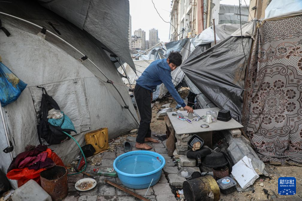 1月13日,一名巴勒斯坦男孩在加沙城整理帐篷外的物品。