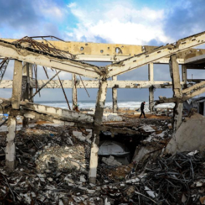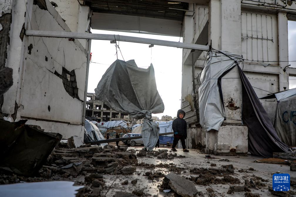 1月13日,一名巴勒斯坦儿童站在加沙城遭强风天气损毁的建筑旁。