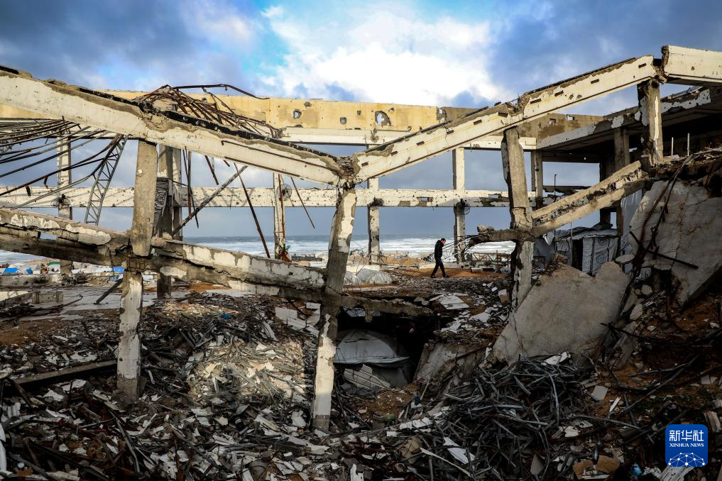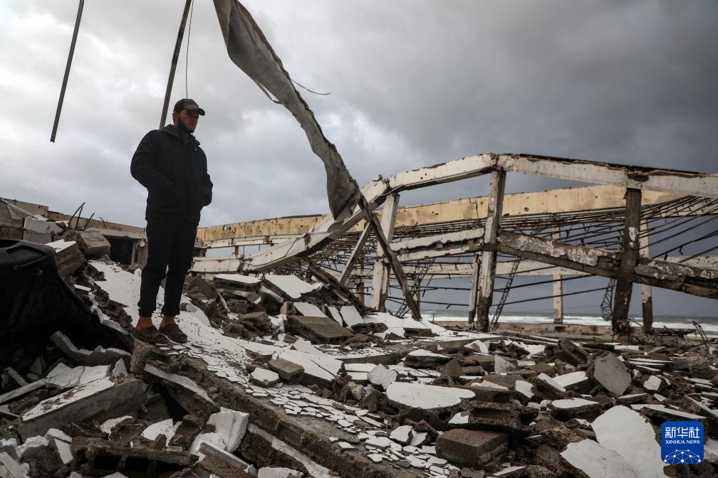 1月13日,一名巴勒斯坦人在加沙城检查遭强风天气损毁的建筑。