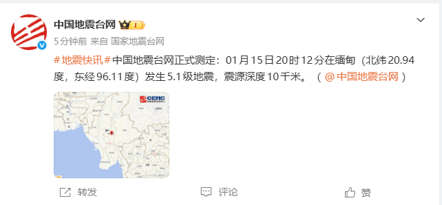 中国地震台网正式测定:1月15日20时12分在缅甸(北纬20.94度,东经96.11度)发生5.1级地震,震源深度10千米。