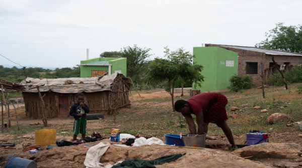 图为2025年12月25日,莫桑比克太特省太特市居民在中国江西国际经济技术合作有限公司建设的卫生间旁洗衣服。(刘杰 摄)