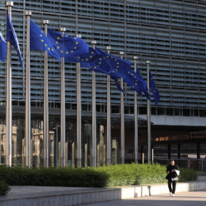 2025年5月23日,在比利时布鲁塞尔,一名男子从欧盟总部大楼外经过。新华社记者赵丁喆摄