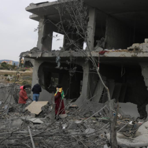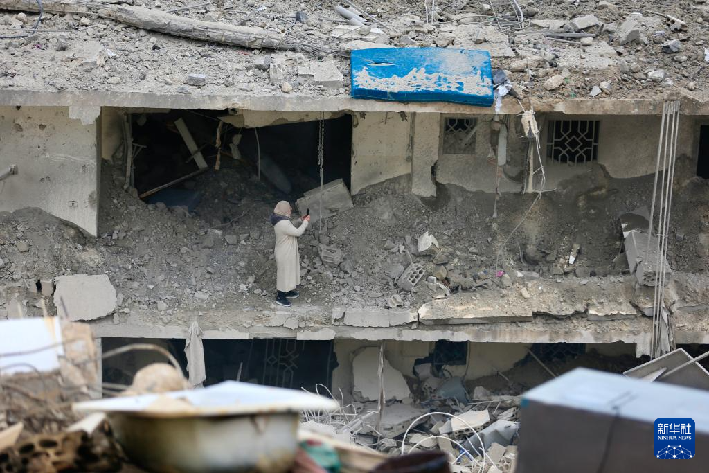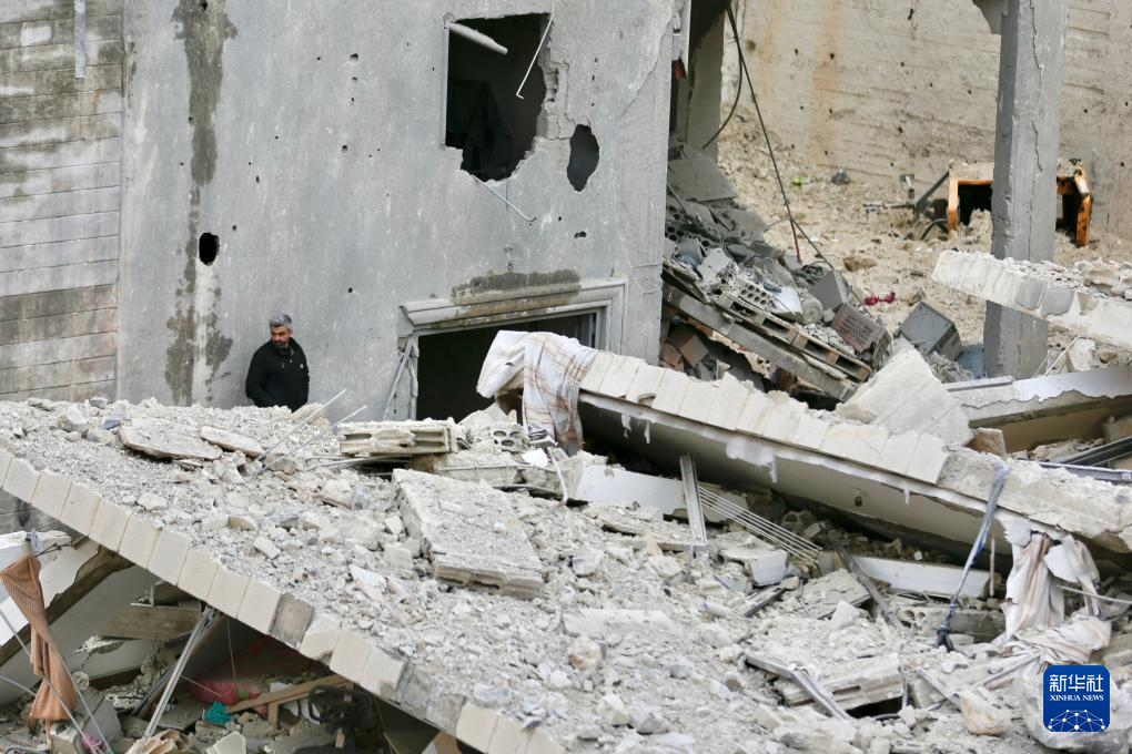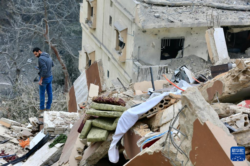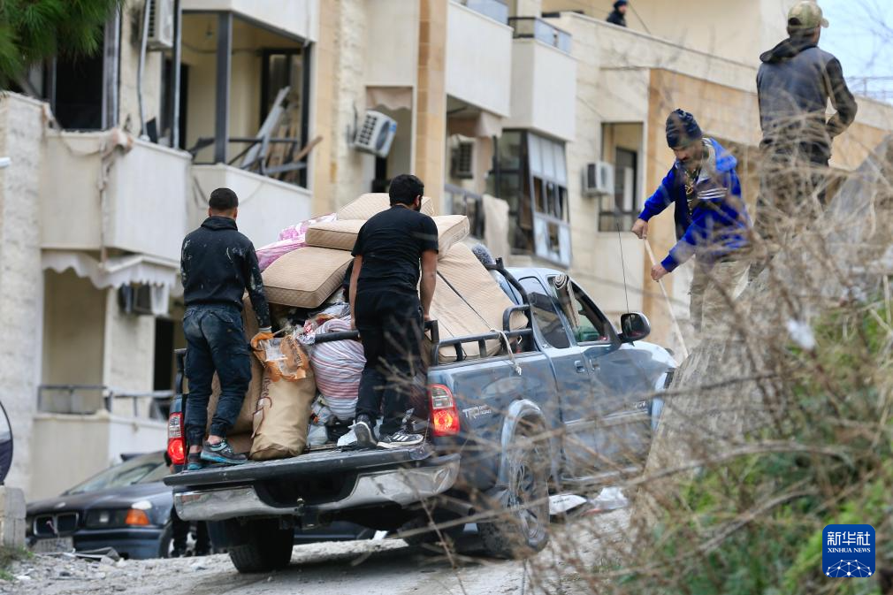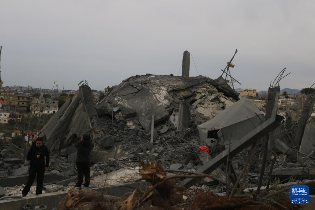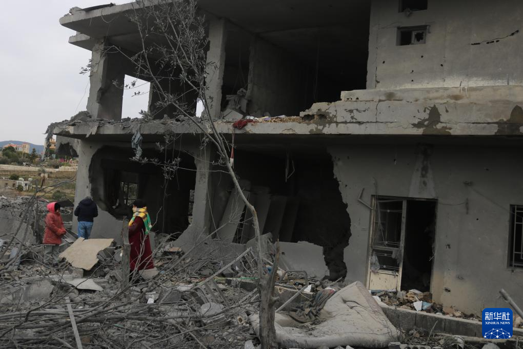 1月22日,在黎巴嫩南部盖纳里特镇,当地居民查看空袭后的受损情况。