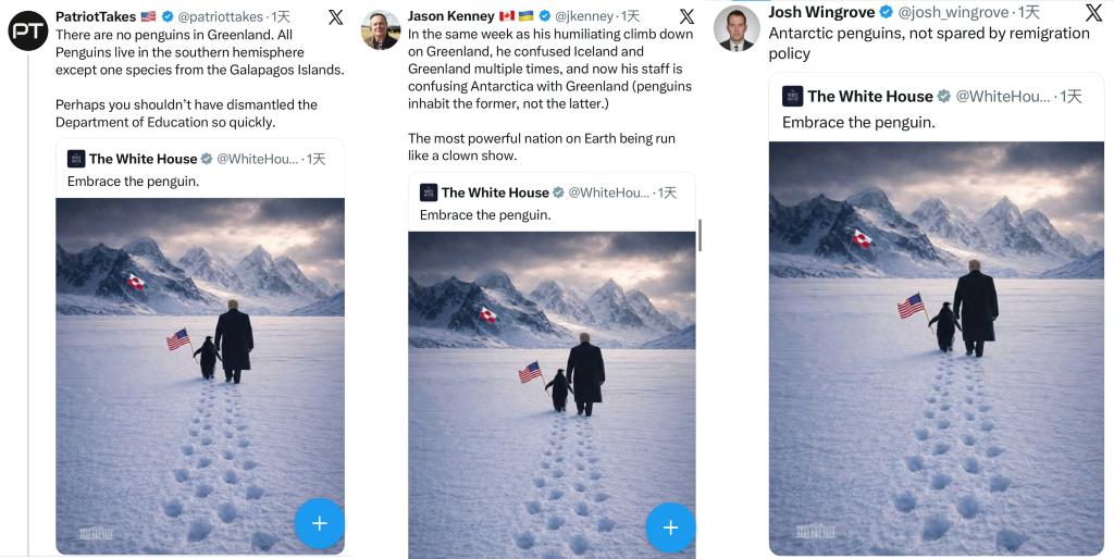 拥有46万多粉丝的X账号“PatriotTakes”回应道:“格陵兰岛没有企鹅……也许你不应该这么快就解散教育部。”