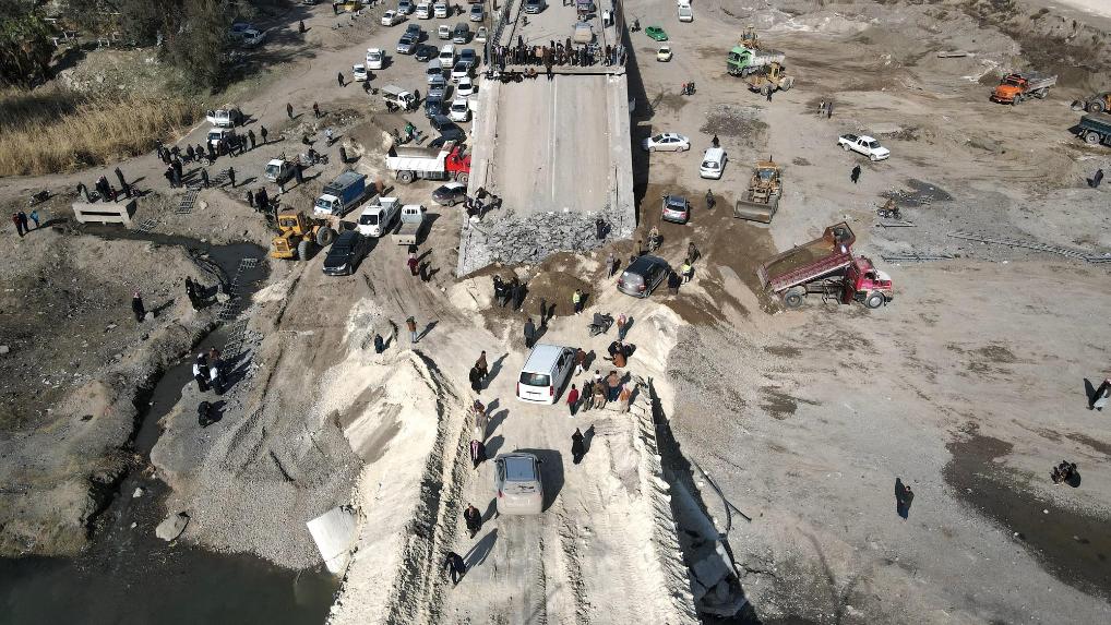 这是1月21日在叙利亚东部拉卡省航拍的在冲突中被炸毁的拉希德大桥。新华社发