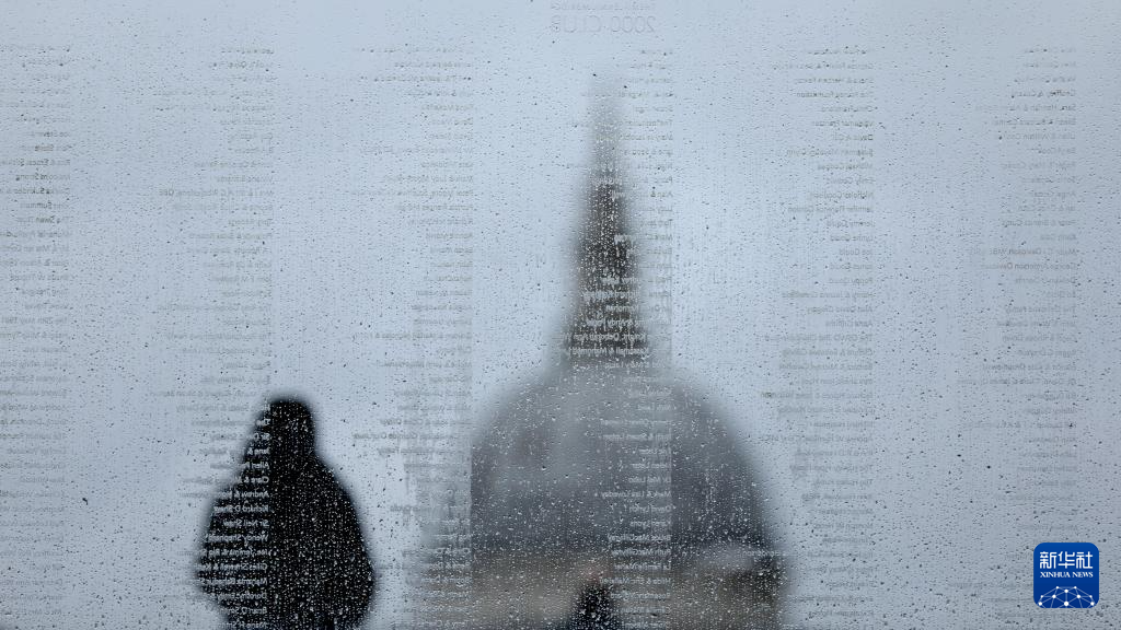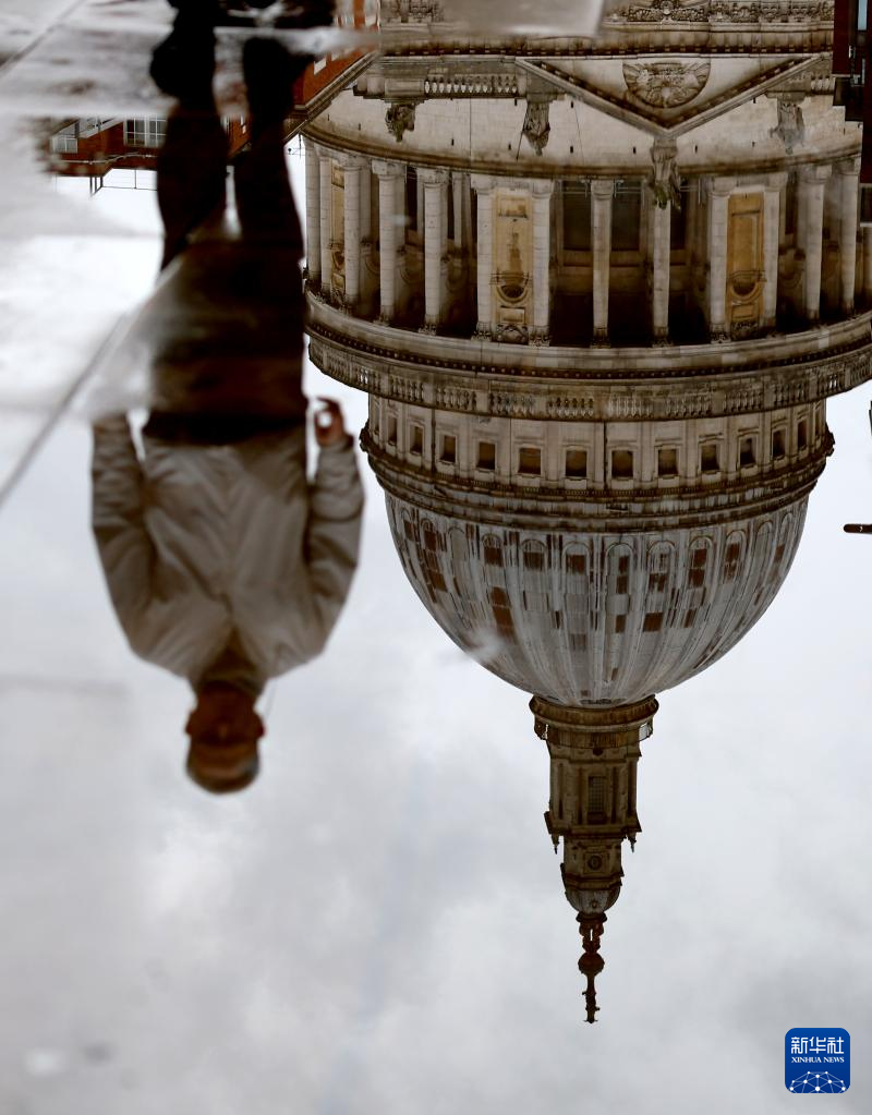 1月27日,在英国伦敦,圣保罗教堂和行人身影倒映在雨后积水中。