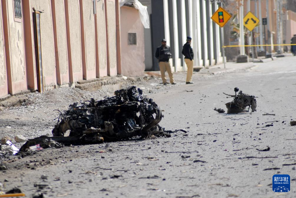1月31日,在巴基斯坦西南部俾路支省奎达地区,当地居民经过被烧毁的车辆。新华社发(阿萨德摄)