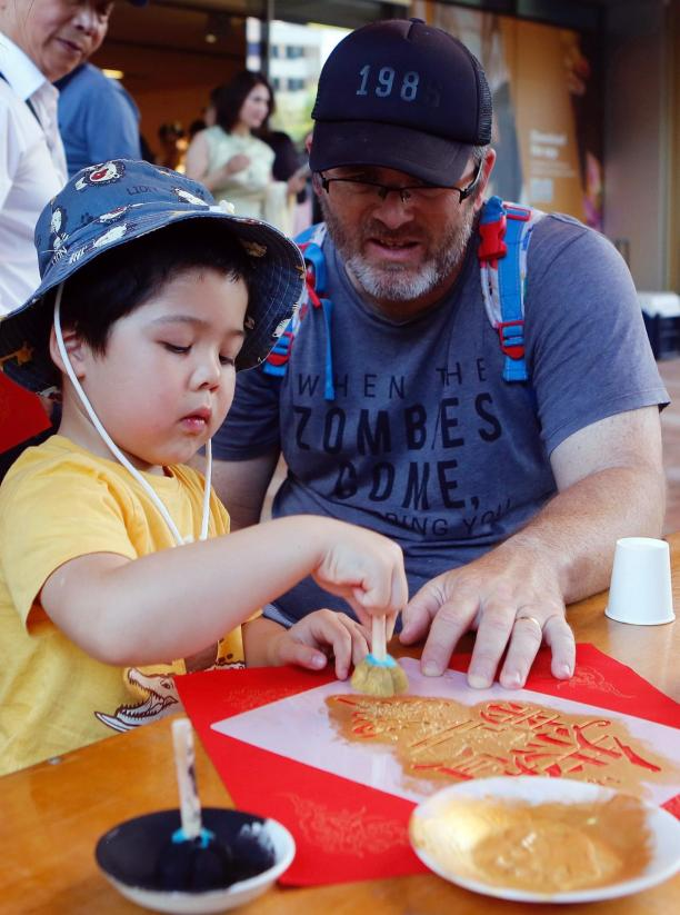 2月1日,在澳大利亚珀斯的西澳大利亚博物馆,当地儿童在家长陪同下拓印新年福贴。(周丹 摄)