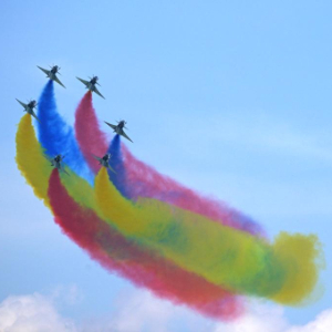 13时许,在云底高900米的气象条件下,中国空军八一飞行表演队精彩亮相。喷涂中国国旗和“八一”军徽的表演机抵达新加坡樟宜展览中心,率先编成超密集六机大箭队,在海面上空拉出红、黄、蓝3种颜色6道彩烟,以低空通场形式向各国来宾致以问候。