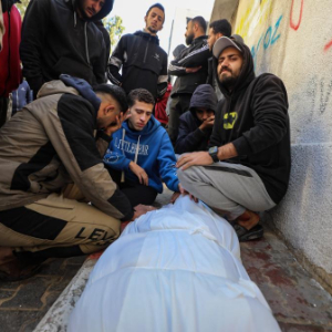 2月4日,在加沙城希法医院里,民众悼念遇难者。新华社发(里泽克·阿卜杜勒贾瓦德摄)
