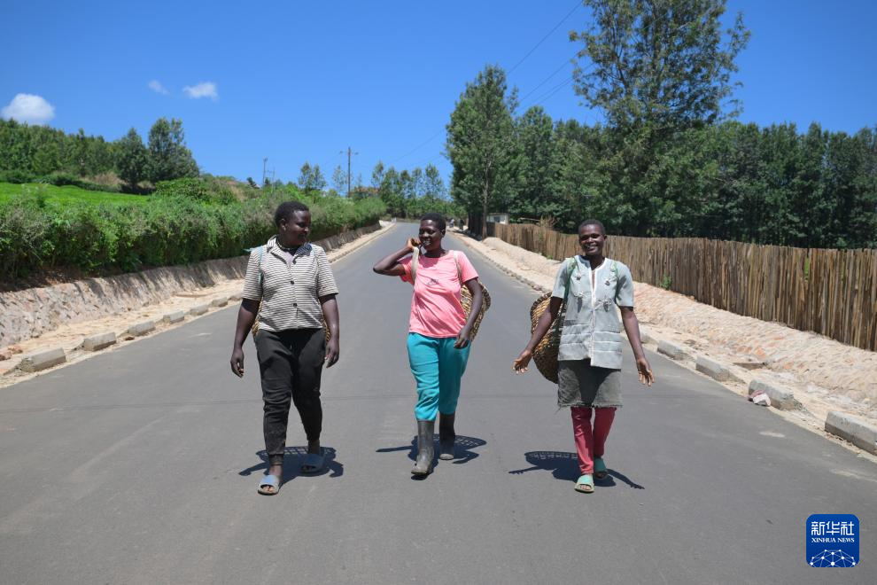 2月4日,在肯尼亚西部的尼亚米拉郡,采茶归来的茶农走在柏油乡村公路上。 新华社记者 杨光 摄