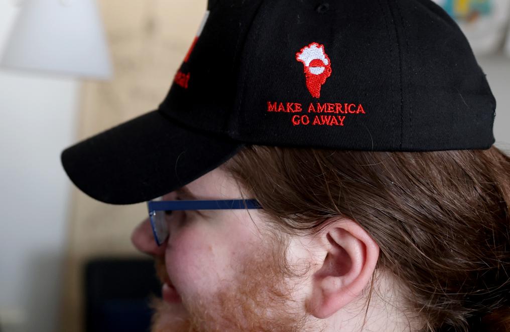 2月7日,在丹麦自治领地格陵兰岛首府努克,学生马利克·谢贝尔头戴印有“让美国走开”字样的帽子。新华社记者 李颖 摄