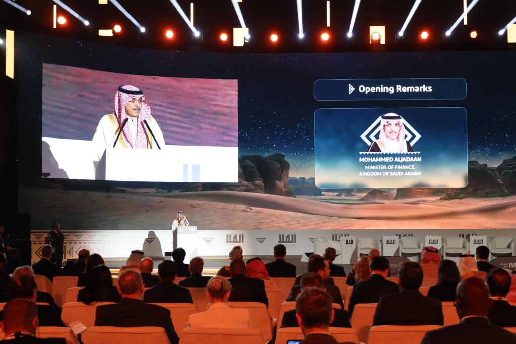 2月8日,在沙特阿拉伯西北部城市埃尔奥拉,沙特阿拉伯财政大臣穆罕默德·贾丹在第二届新兴市场经济体埃尔奥拉会议开幕式上致辞。新华社记者罗晨摄