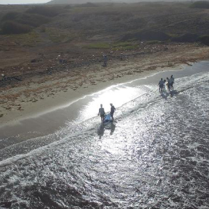 2月11日,在佛得角圣地亚哥岛圣多明戈斯市莫亚莫亚社区附近,当地妇女在海滩上收集海藻(无人机照片)。