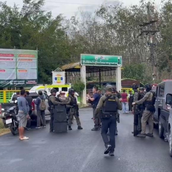 这张2月11日发布在泰国宋卡府公共关系部门社交媒体上的照片显示,应急人员聚集在发生校园枪击案的学校。