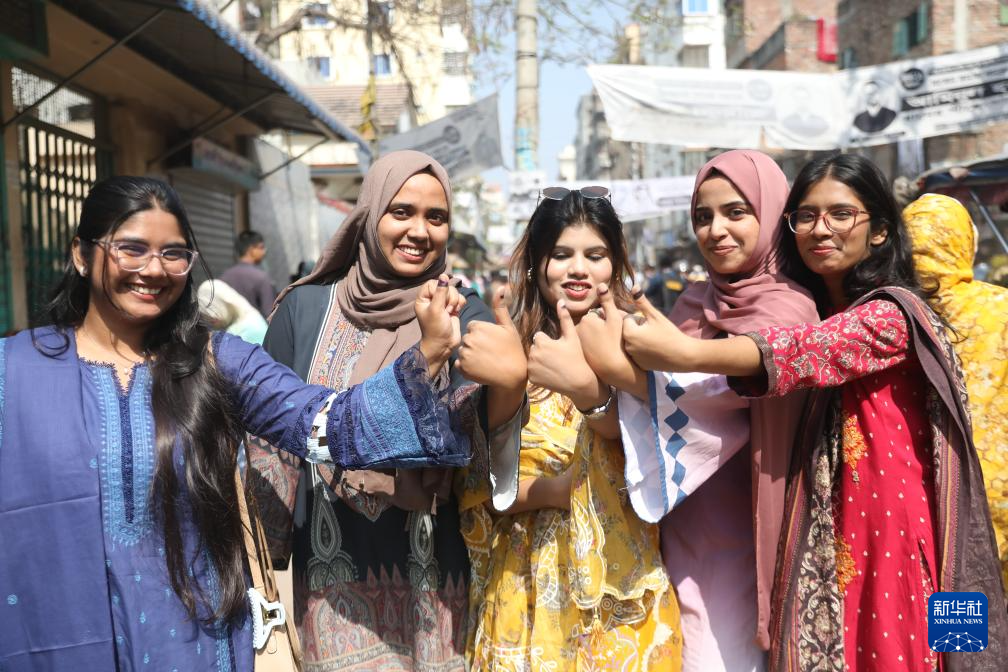 2月12日,在孟加拉国首都达卡一处投票站,几名女子投完票后展示沾有墨水的手指。新华社发(哈比卜·拉赫曼摄)