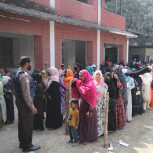 2月12日,在孟加拉国首都达卡一处投票站,选民排队参加国民议会选举。新华社发(哈比卜·拉赫曼摄)