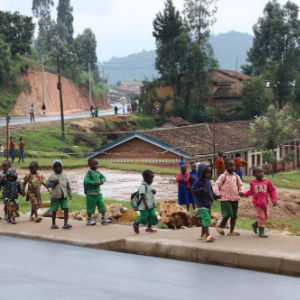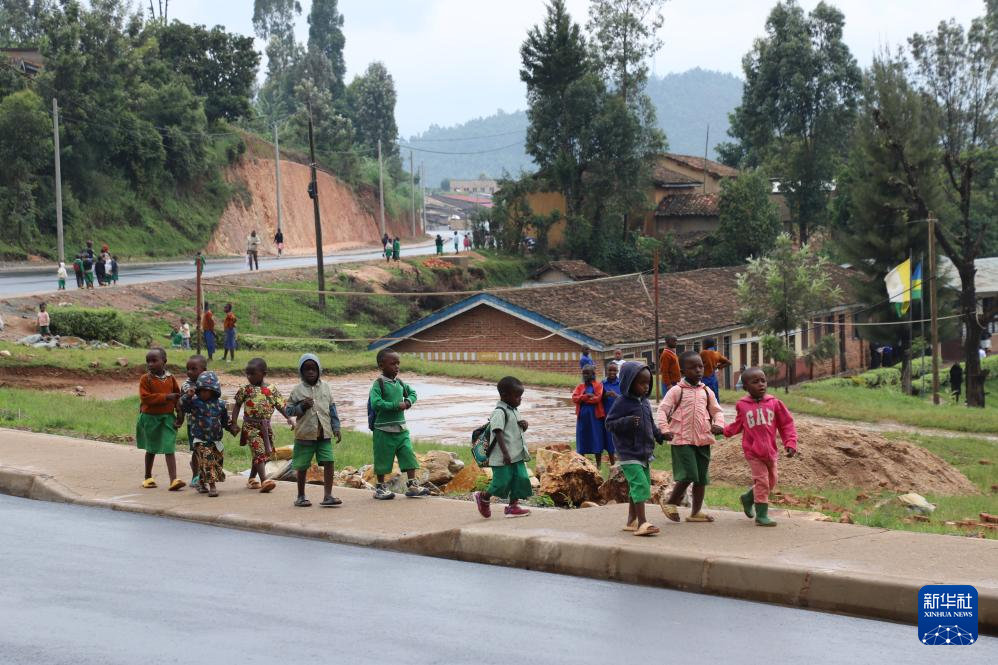 2月9日,在卢旺达南方省的穆汉加地区,当地儿童在中国电建市政建设集团有限公司承建的公路旁行走。 新华社记者 鞠银河 摄