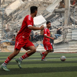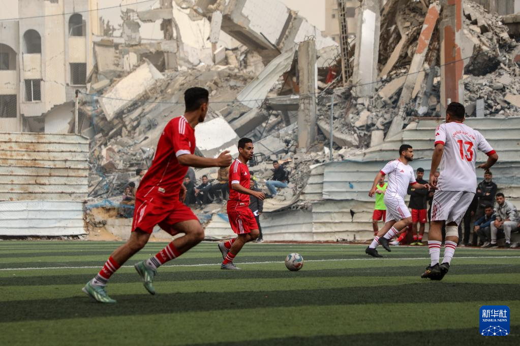 2月14日,在加沙城南部,当地民众在被摧毁的建筑废墟附近参加一场足球赛。