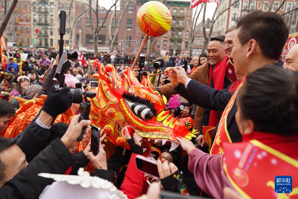2月17日,人们在美国纽约中国城的庙会现场参加“龙头点睛”。