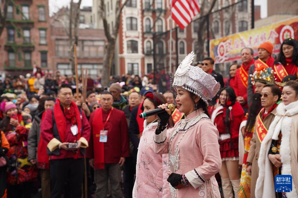 2月17日,歌手在美国纽约中国城的庙会现场演唱歌曲。