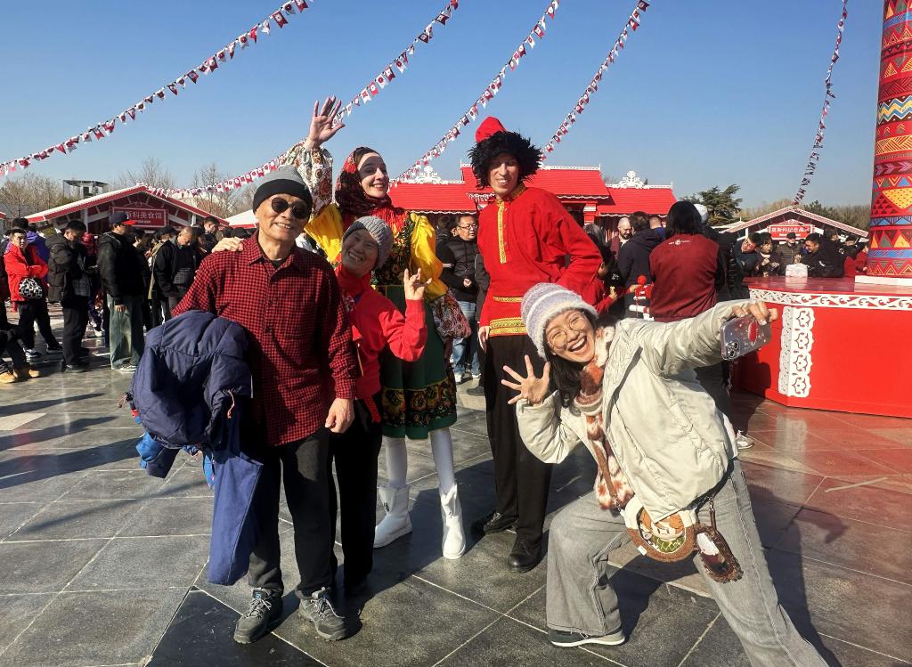 2026年2月19日,游客在北京朝阳公园与俄罗斯演员互动。新华社记者 杨淑君 摄
