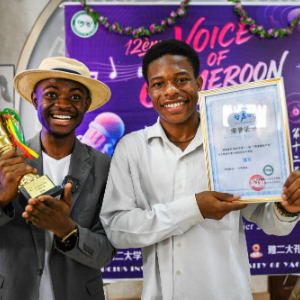 2月20日,在喀麦隆索阿,获得第12届“喀麦隆好声音”中文歌曲大赛冠军的选手展示奖杯和证书。