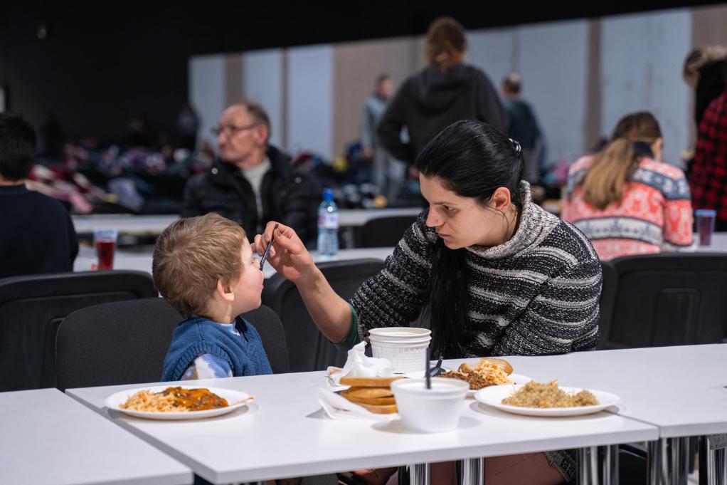 2022年3月8日,在波兰华沙,一名乌克兰妇女在喂自己的孩子吃饭。新华社发(华沙PTAK国际会展中心供图)
