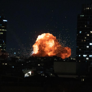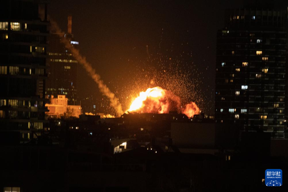 2月28日晚,以色列特拉维夫市区传出巨大爆炸声,有建筑物冒出火光。新华社记者 陈君清 摄