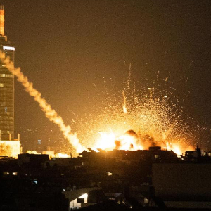 2月28日晚,以色列特拉维夫市区传出巨大爆炸声,有建筑物冒出火光。新华社记者陈君清摄