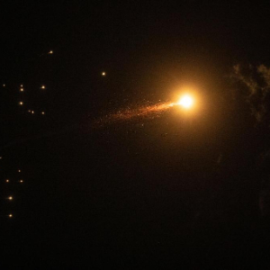 3月1日,在以色列特拉维夫上空,以军拦截弹击中导弹,导弹碎片落下。新华社记者陈君清摄
