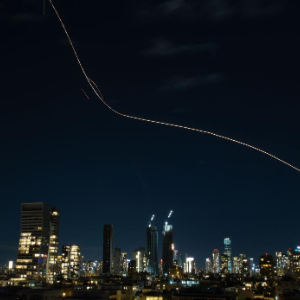 3月1日,在以色列特拉维夫上空,以军防空系统发射拦截弹后留下光轨。