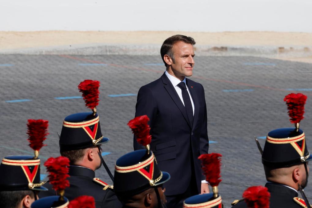 2024年7月14日,在法国巴黎凯旋门附近,法国总统马克龙出席国庆阅兵式。新华社发(亨利·施瓦茨摄)