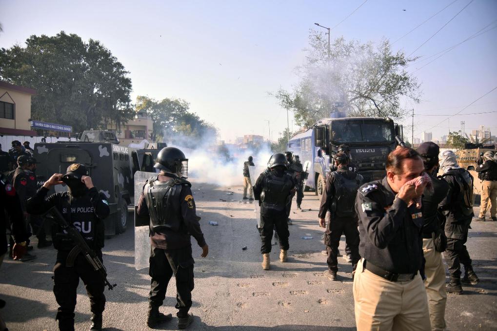3月1日,执法人员(画面右侧)在巴基斯坦南部城市卡拉奇的美国驻卡拉奇领事馆外控制局势。新华社发(伊姆兰·阿里摄)