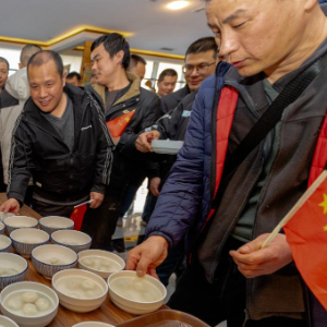 当天正值中国元宵节,为迎接同胞,使馆在酒店大堂专门准备了汤圆。鲁梅将热气腾腾的汤圆一碗一碗递给大家。