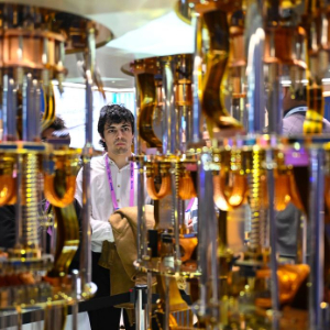3月5日,在西班牙巴塞罗那举行的2026年世界移动通信大会上,一名男子在展厅参观。