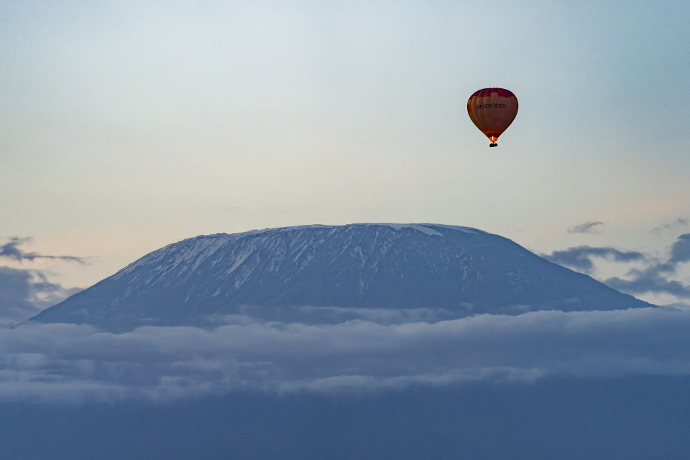 晨光熹微中,一只热气球点火升空,缓缓越过云层,不远处便是非洲第一高峰乞力马扎罗山。