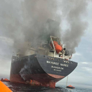 这张泰国海军2026年3月11日发布的照片显示,一艘泰国货船在霍尔木兹海峡海域遭袭起火。新华社发(泰国海军供图)