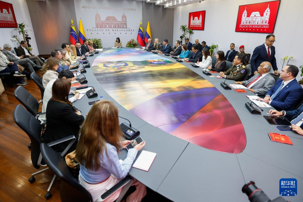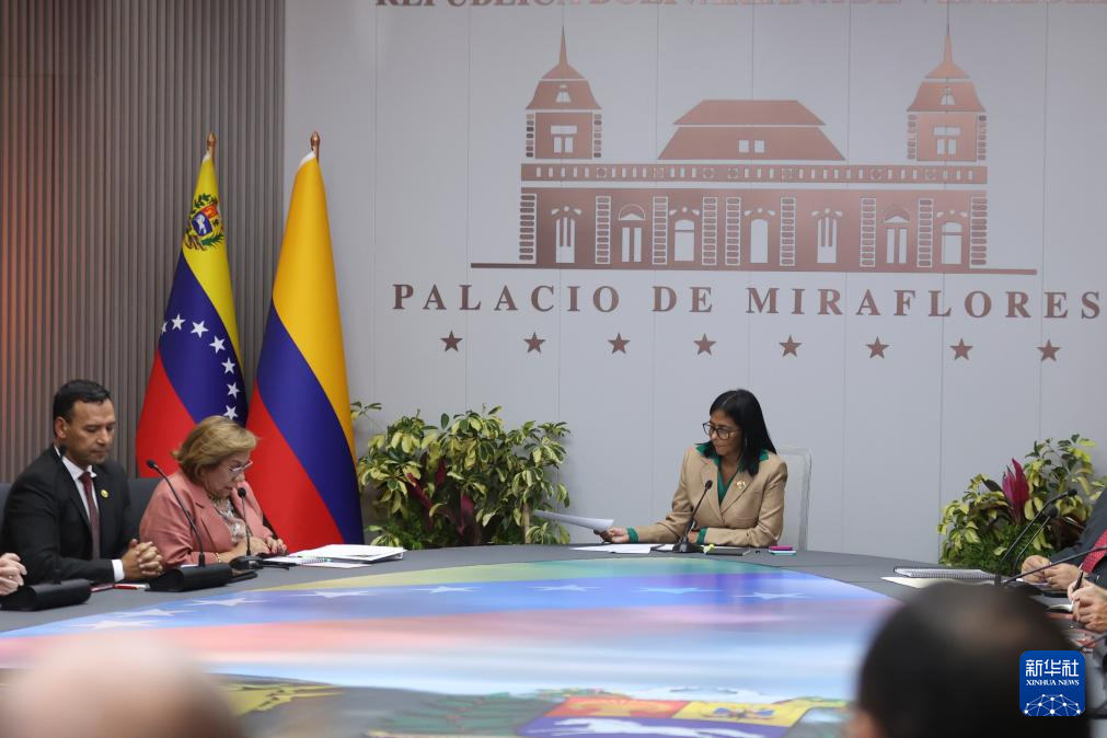 3月13日,委内瑞拉代总统德尔西·罗德里格斯(中)在位于加拉加斯的总统府与哥伦比亚代表团举行会晤。新华社发